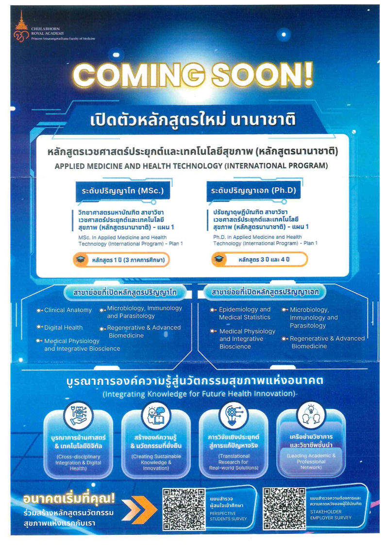 ด้วยคณะแพทยศาสตร์ศรีสวางควัฒน ราชวิทยาลัยจุฬาภรณ์ มีแผนพัฒนาหลักสูตรระดับบัณฑิตศึกษา ได้แก่ หลักสูตรปรัชญาดุษฎีบัณฑิต และหลักสูตรวิทยาศาสตร์มหาบัณฑิต สาขาเวชศาสตร์ประยุกต์และเทคโนโลยีสุขภาพ (นานาชาติ) (หลักสูตรใหม่) จึงใคร่ขออนุเคราะห์ประชาสัมพันธ์แบบสำรวจความต้องการและความคาดหวังของผู้ใช้บัณฑิตและผู้สนใจศึกษาต่อ